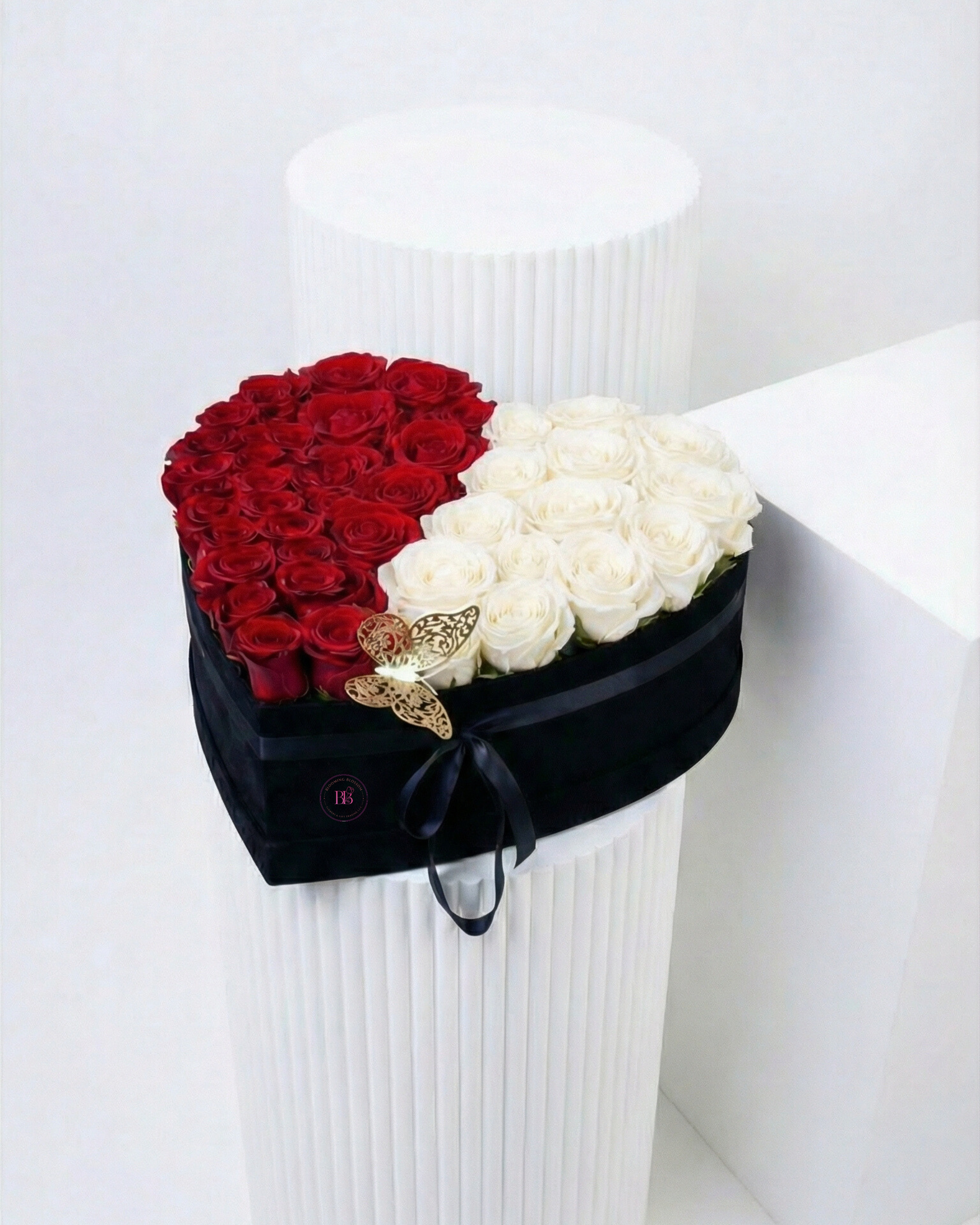 Love Essence Is A Beautifully Crafted Heart-Shaped Floral Arrangement Featuring A Perfect Blend Of Fresh Red And White Roses. Symbolising Love, Purity, And Togetherness, This Elegant Design Is Ideal For Valentine’s Day, Anniversaries, Graduations, And Meaningful Celebrations Where Emotions Matter Most.