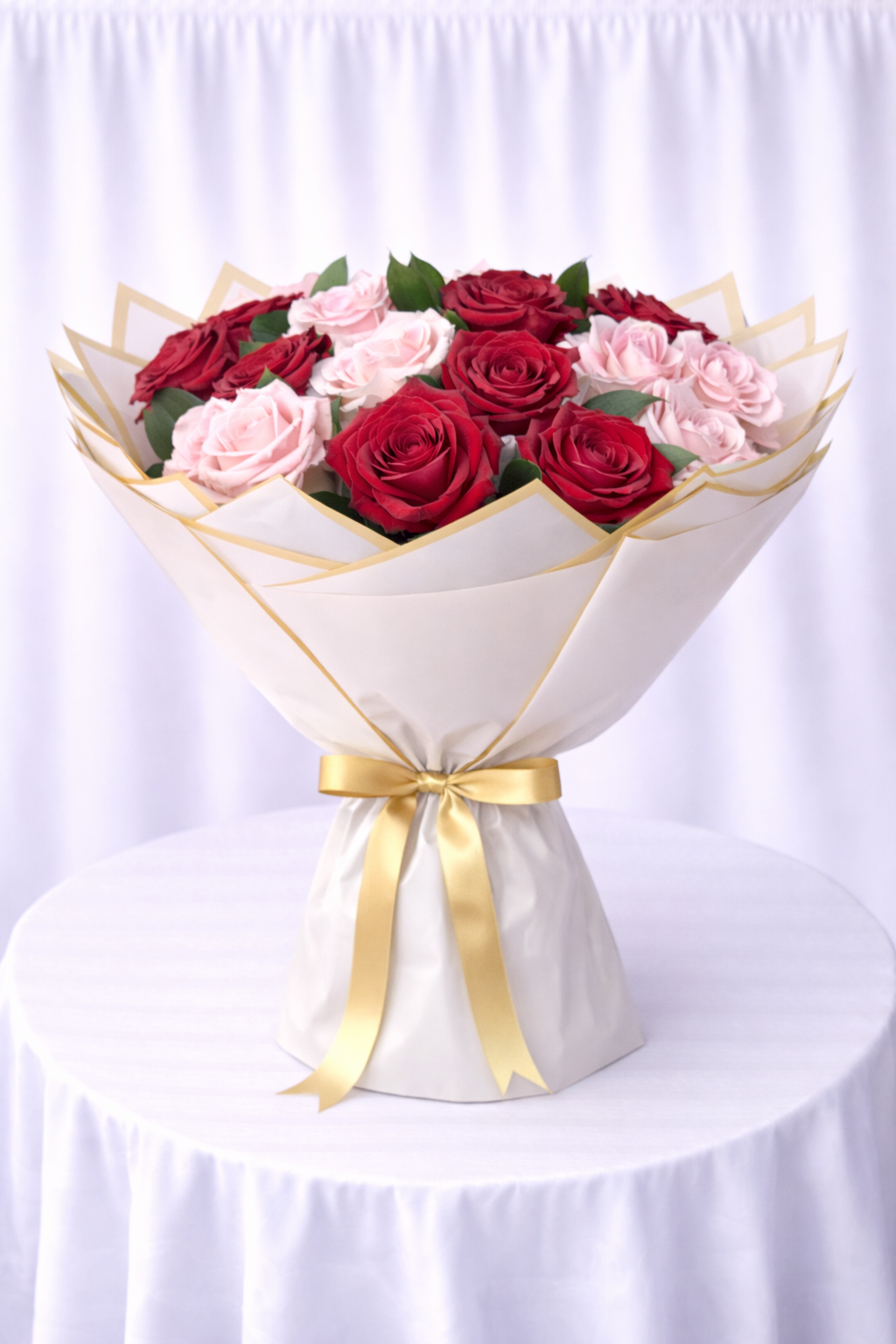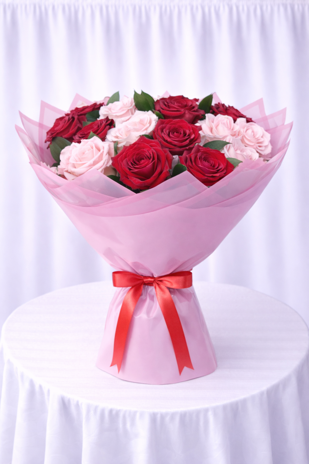 Blush & Ruby Is A Beautifully Hand-Tied Bouquet Featuring A Harmonious Blend Of Deep Red And Soft Blush Roses, Elegantly Wrapped For A Timeless And Romantic Look. Designed To Express Love, Appreciation, And Celebration, This Bouquet Is Perfect For Anniversaries, Birthdays, And Meaningful Occasions. Finished With Premium Wrapping And A Satin Ribbon For A Luxurious Touch.