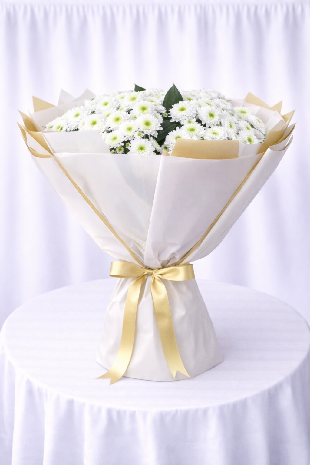 Ivory Charm Is A Fresh And Elegant Hand-Tied Bouquet Featuring Crisp White Santhini Wrapped Beautifully For A Clean And Graceful Look. Symbolizing Purity, Positivity, And New Beginnings, This Bouquet Is Perfect For Thoughtful Gifting, Celebrations, And Everyday Joyful Moments. Finished With Soft Wrapping And A Satin Ribbon For A Timeless Presentation.