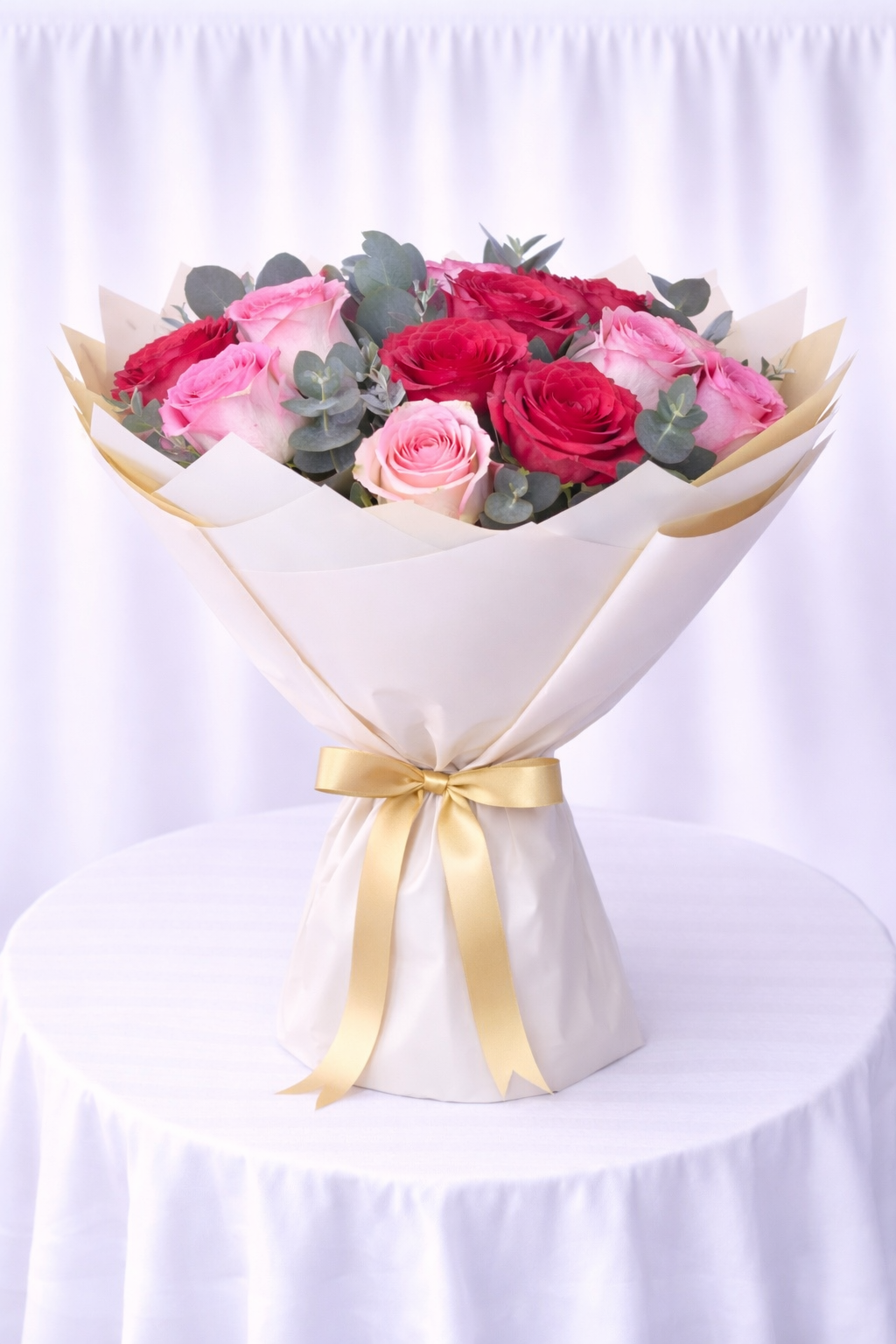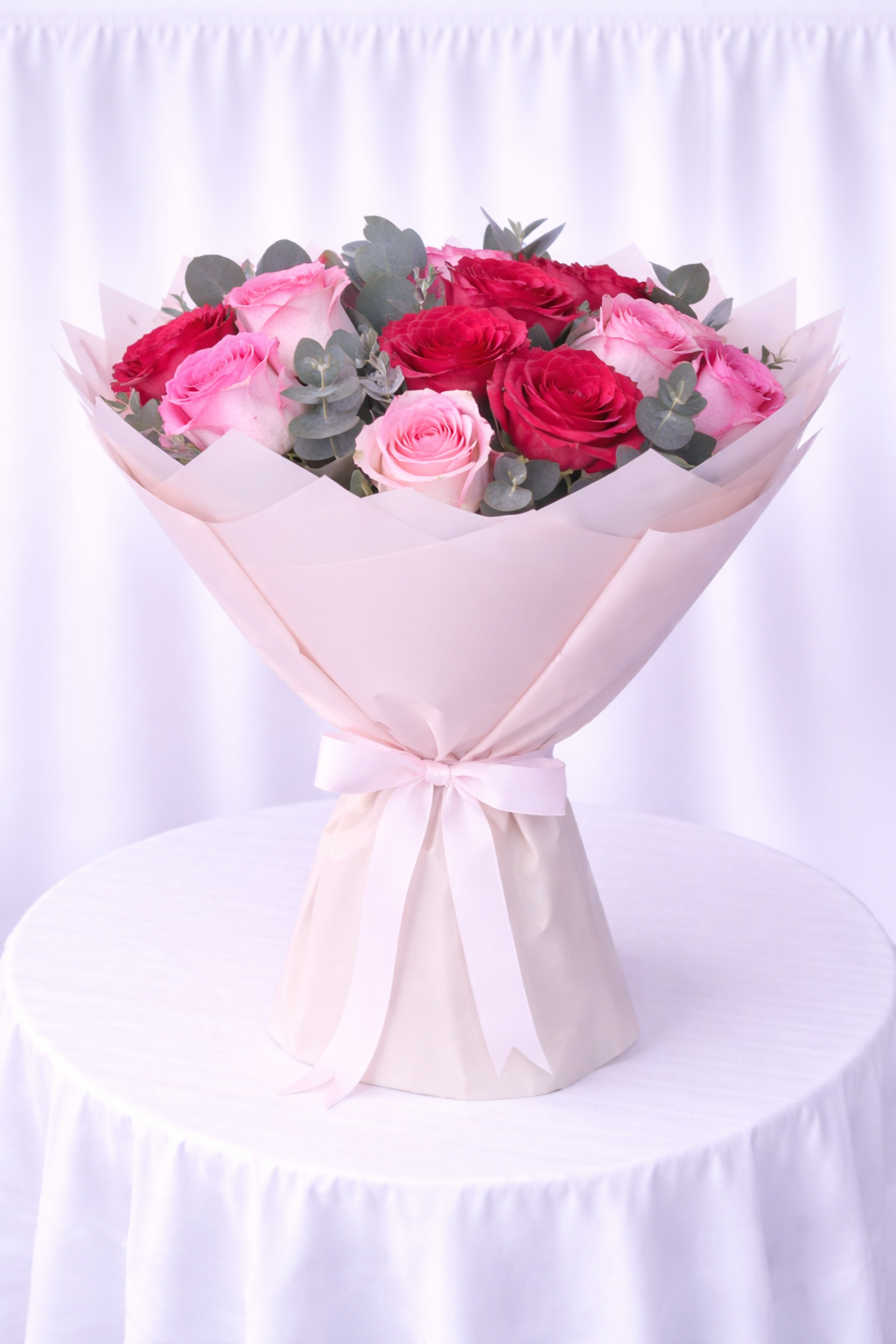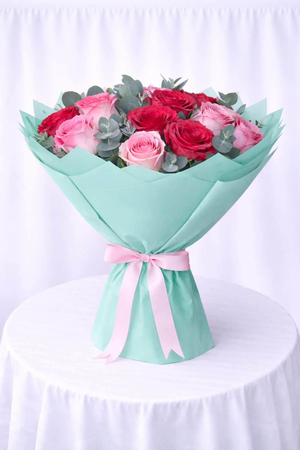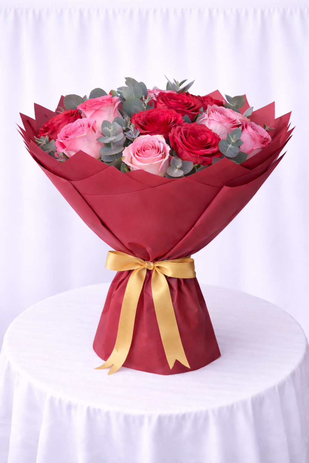 Fresh Red Roses And Rivaval Pink Roses And Eucalyptus