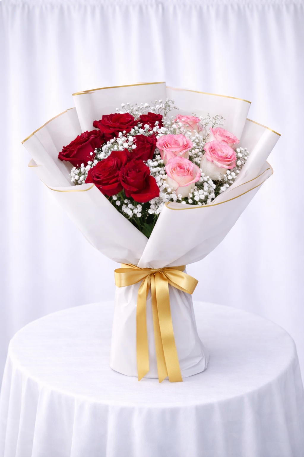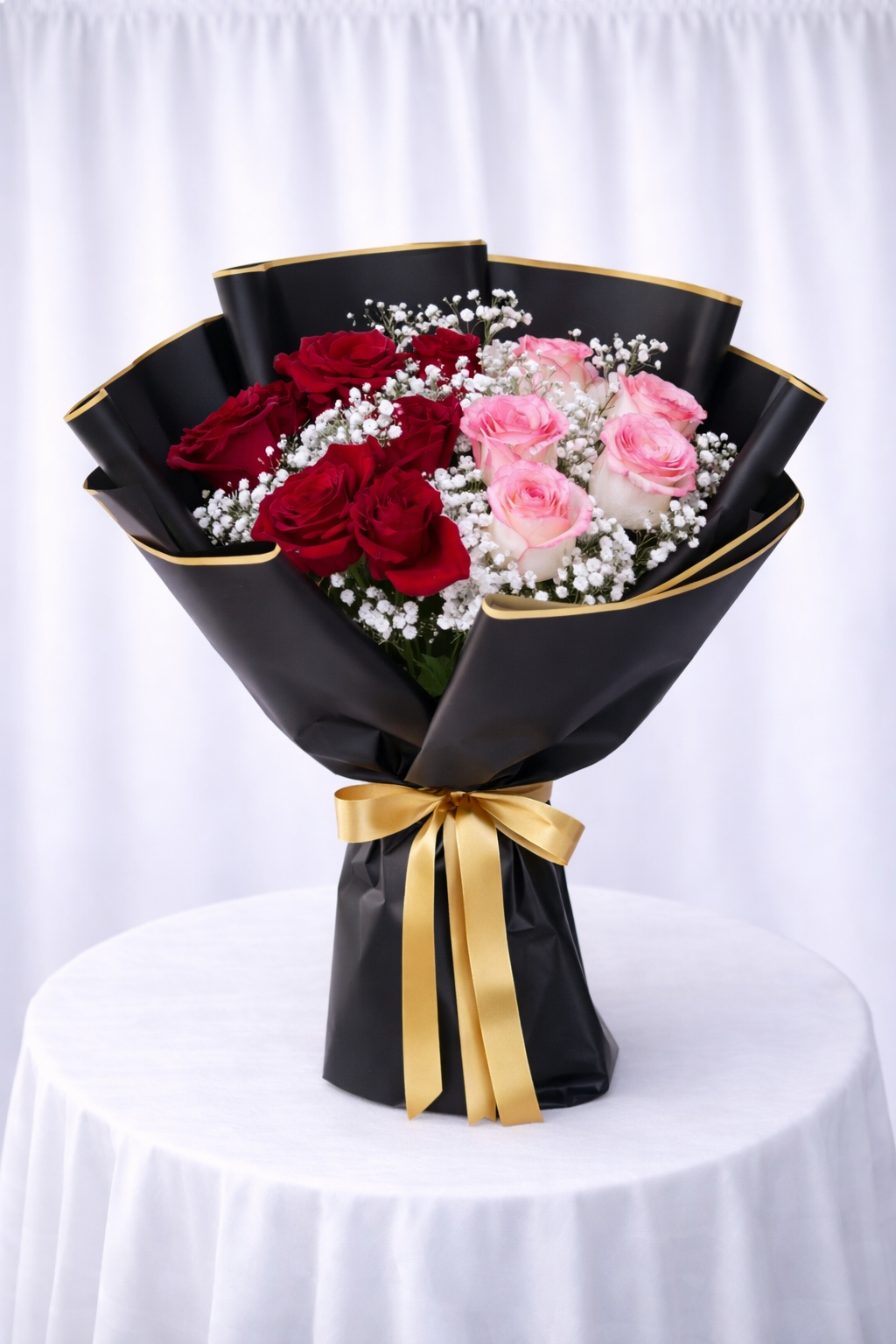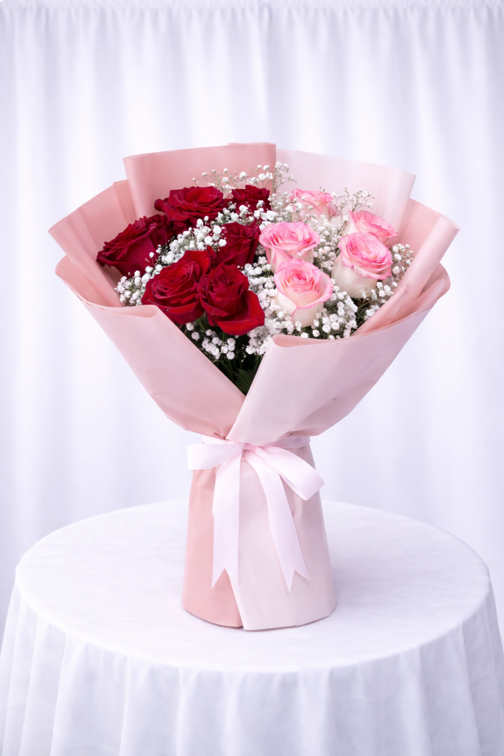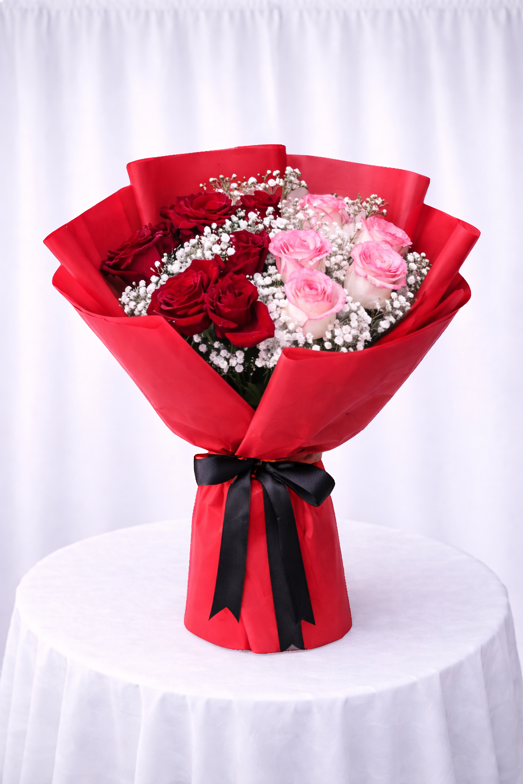 Scarlet Blush Bouquet Is A Charming And Expressive Arrangement Designed To Celebrate Love And Joy. Featuring Rich Red Roses Paired With Soft Pink Accents, Beautifully Wrapped In White, Pink, Black, Or Red Paper, This Bouquet Creates A Balanced Look Of Passion And Elegance. Handcrafted By Our Expert Florists, It Is Ideal For Anniversaries, Birthdays, And Heartfelt Celebrations.