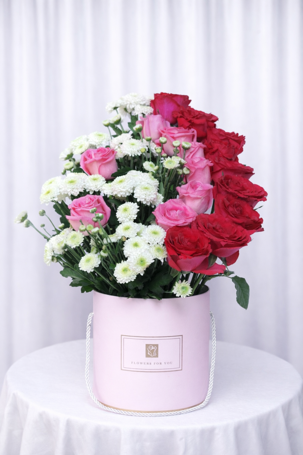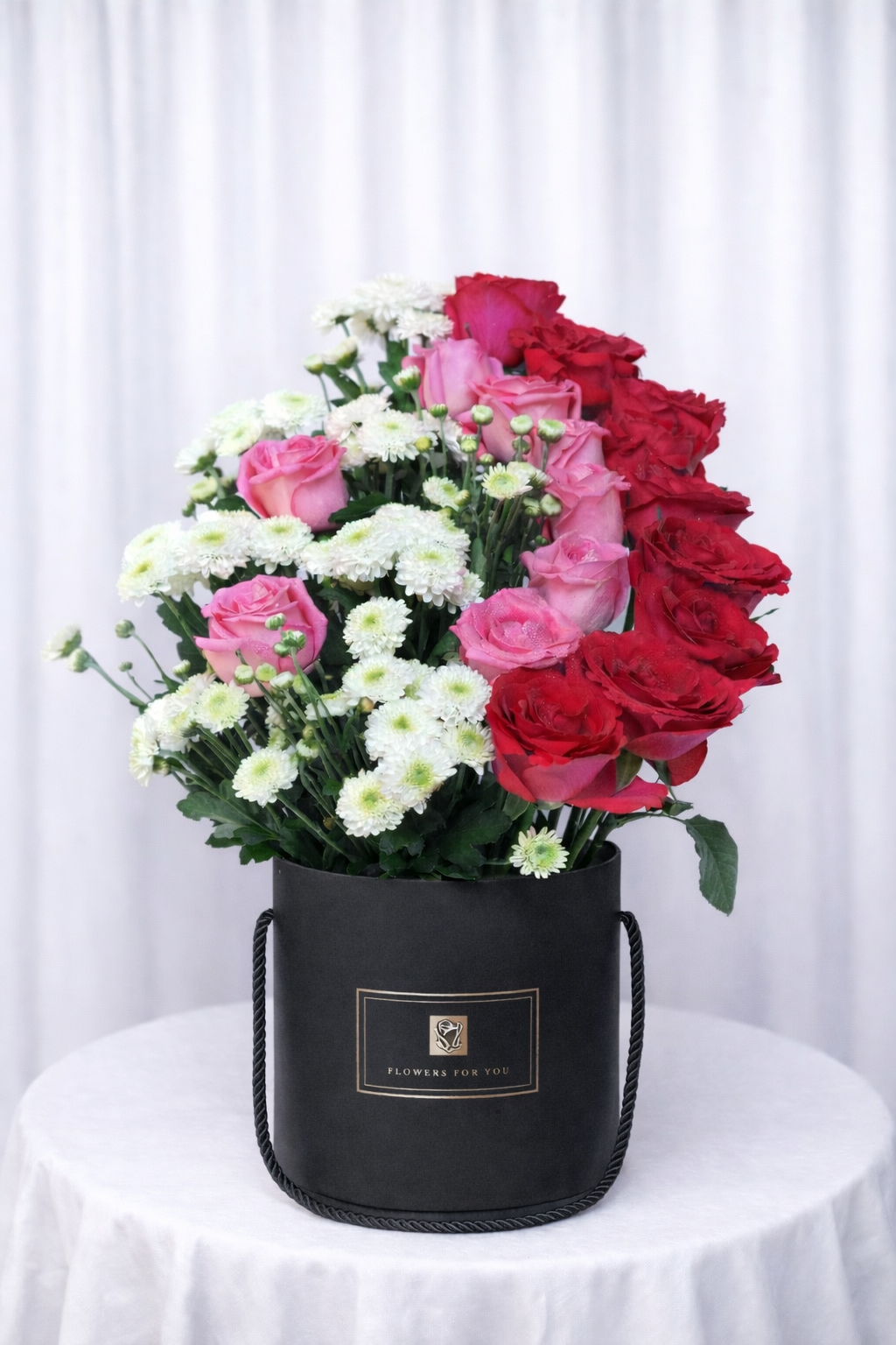 Crimson Harmony Hatbox Is A Bold And Elegant Hat Box Flower Arrangement Featuring Fresh Red Roses Beautifully Balanced With Soft White And Pink Accent Flowers, Presented In A Premium White, Black, Or Pink Hat Box For A Striking And Luxurious Finish. This Luxury Mixed Flower Arrangement Symbolises Love, Strength, And Celebration, Making It Perfect For VIP Gifting, Romantic Occasions, And Special Celebrations.